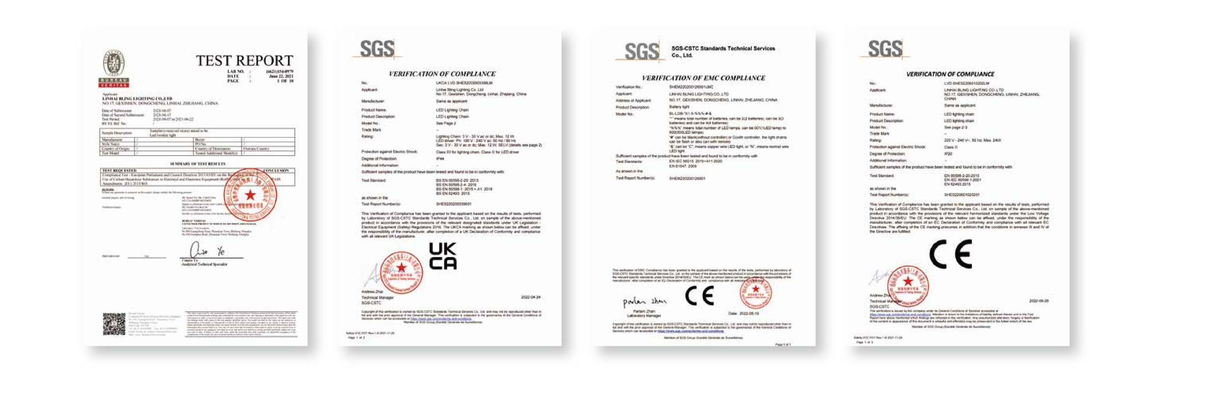 Vega貿易株式会社 が取り扱うLED装飾照明製品は、国際的な品質基準に基づき、複数の第三者検査機関による試験・認証を取得しております。